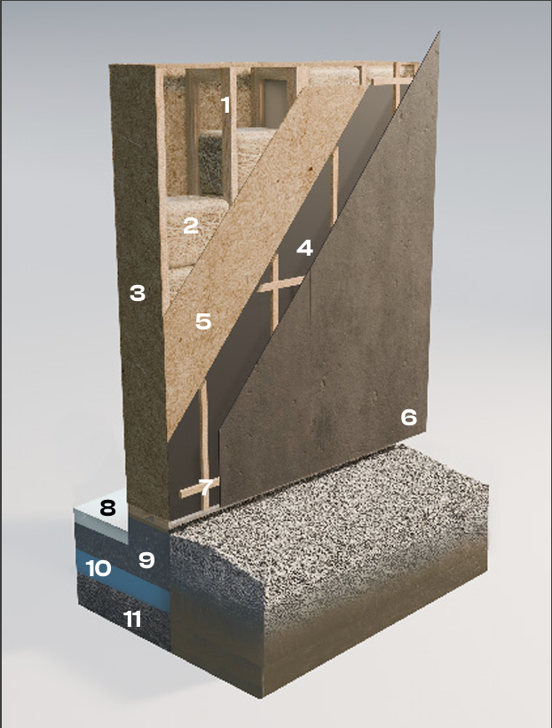 > Une ossature bois, issue de forêts locales et gérées durablement, soutient la structure et assure la stabilité et la résistance du mur.